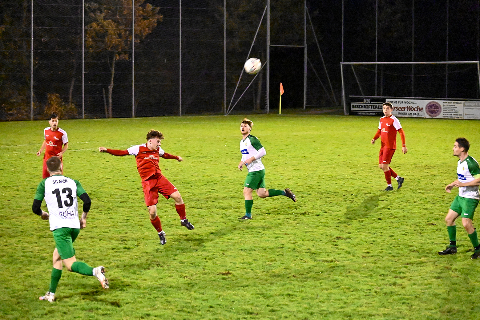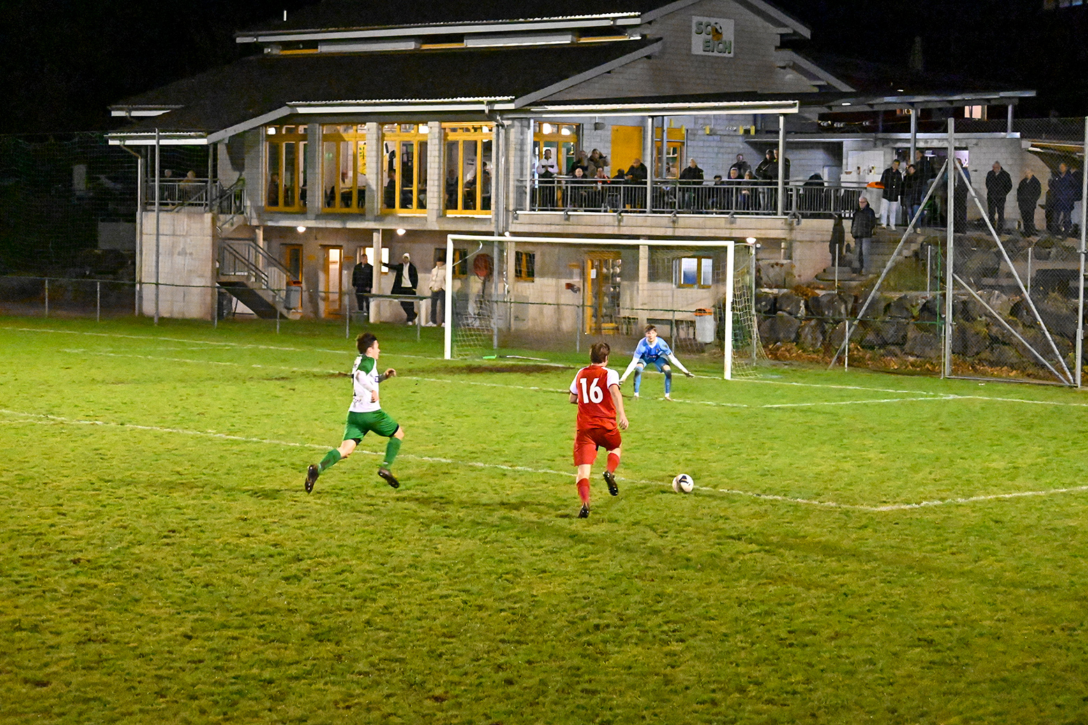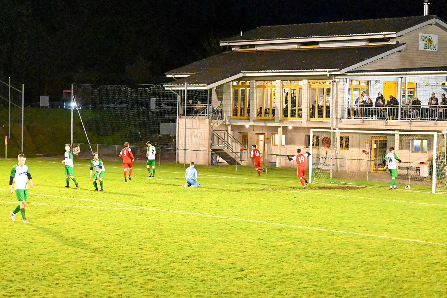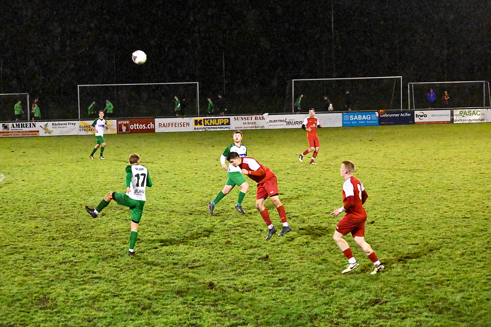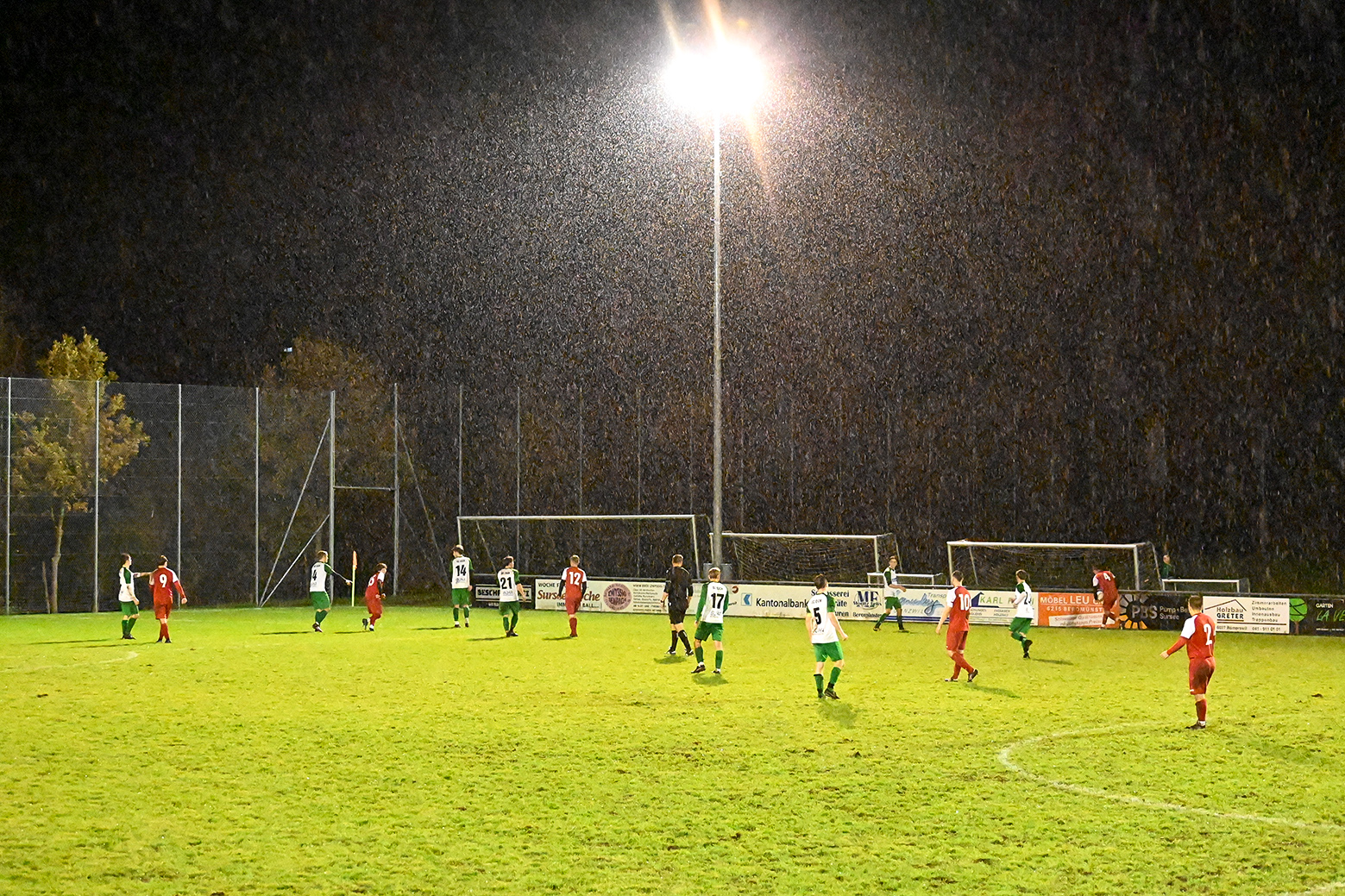 Nach dem Seitenwechsel wurde das Spiel zunehmend zerfahren. Viele hohe Bälle, harte Zweikämpfe und der noch tiefer werdende Boden prägten das Geschehen. Mit dem einsetzenden Regen verwandelte sich der Platz endgültig in ein Schlachtfeld. In der 61. Minute gab es den ersten Aufreger, als eine Flanke von Eichs Küng immer länger wurde und auf die Lattenoberkante klatschte – Glück für die Gäste.
